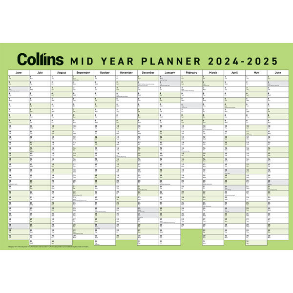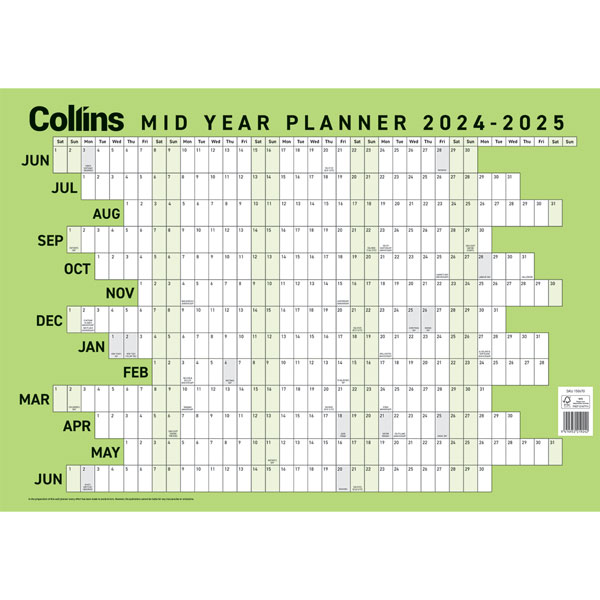 COLLINS MID YEAR WALL PLANNER LAMINATED A2 2024/2025