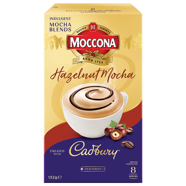 The perfect blend of Moccona coffee combined with Cadbury cocoa and a hint of Hazelnut flavour, that delivers a creamy indulgent mocha experience, finished with a layer of velvety froth.